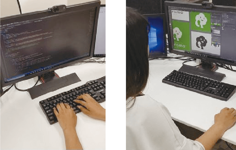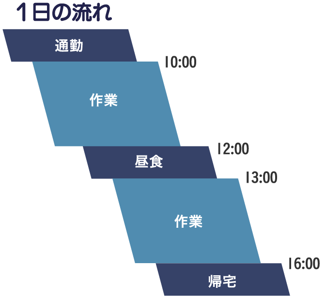 下記の左の写真はPCでの訓練の様子、中央はデザイン作業の様子、右側の図は事業所の1日の流れのになります。具体的には、午前10時までに出勤いただき、朝礼をはさんで訓練開始となります。お昼は1時間の休憩で午後1時より訓練開始となります。午後4時に学習終了していただき帰宅となります。