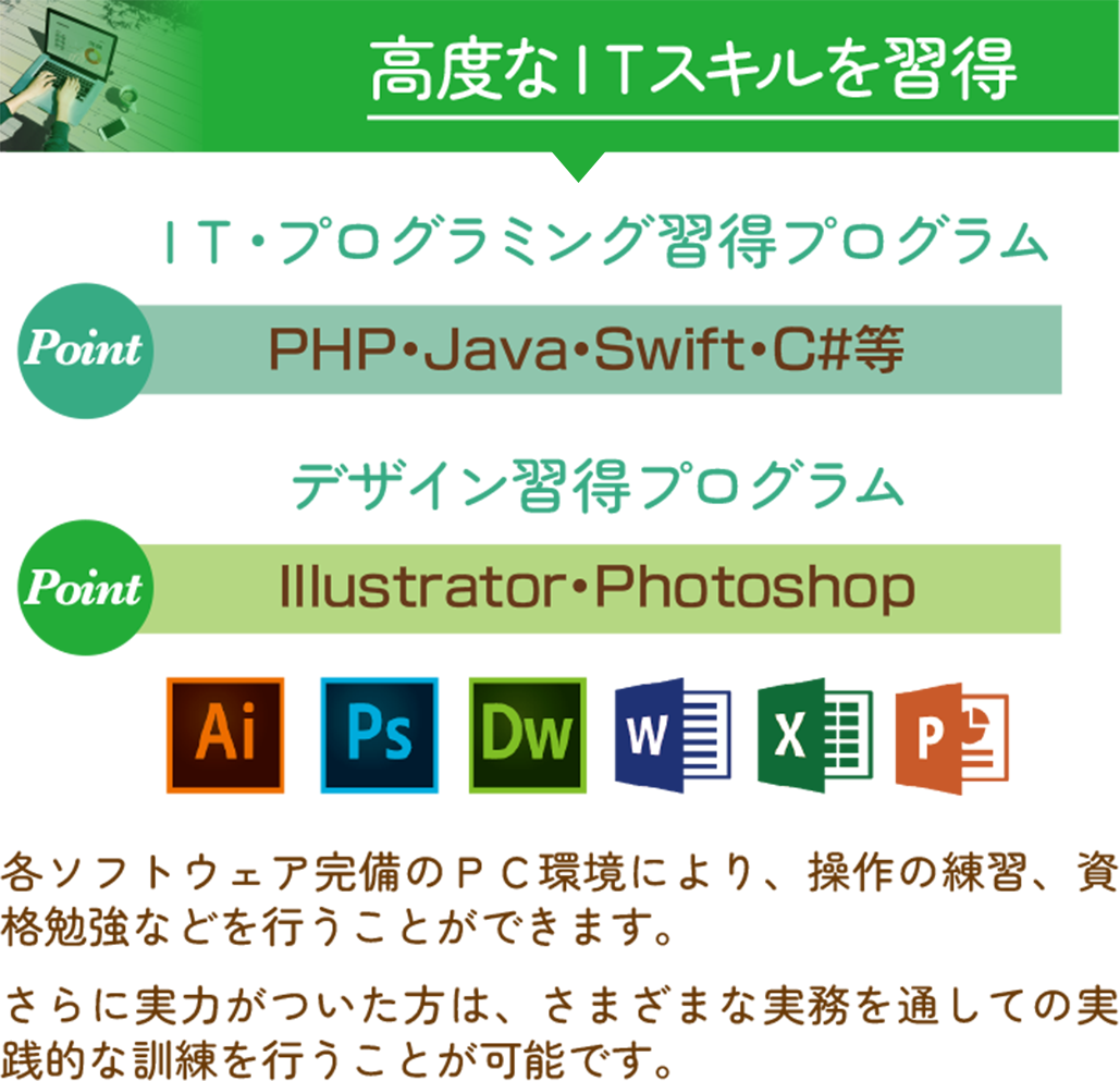 下記の左の図は訓練内容について紹介しています。まずマイクロソフトオフィス(ワード、エクセル、パワーポイント)の基礎を学んでいただき、さらに高度なプログラミングについての知識を学べます。具体的にはシーシャープ、ピーエッチピー、ジャバ等です。またデザイン習得プログラムでについてはイラストレーター、フォトショップ、動画編集等をを学べます。さらにウェブサイト制作(HTML、WordPress)を学習できます。以上、各ソフトウェア完備のPC環境により、操作の練習、資格勉強などを行うことができます。さらに実力がついた方は、さまざまな実務を通しての実践的な訓練を行うことが可能です。
