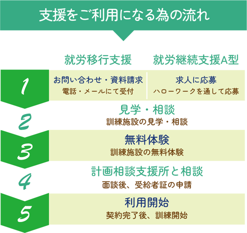 下記の右の図は就労支援をご利用になる為の流れについて紹介しています。まず最初に電話やメールにてお問い合わせをして資料請求をしていただけます。その後、事業所での見学や相談をしていただきご希望により訓練施設内での無料体験ができます。施設ご利用を承諾していただけましたら、まず受給者証が必要になりますので計画相談支援所と詳しくご相談いただき、その申請を行なっていただきます。受給者証の申請が終わり次第、利用開始となります。